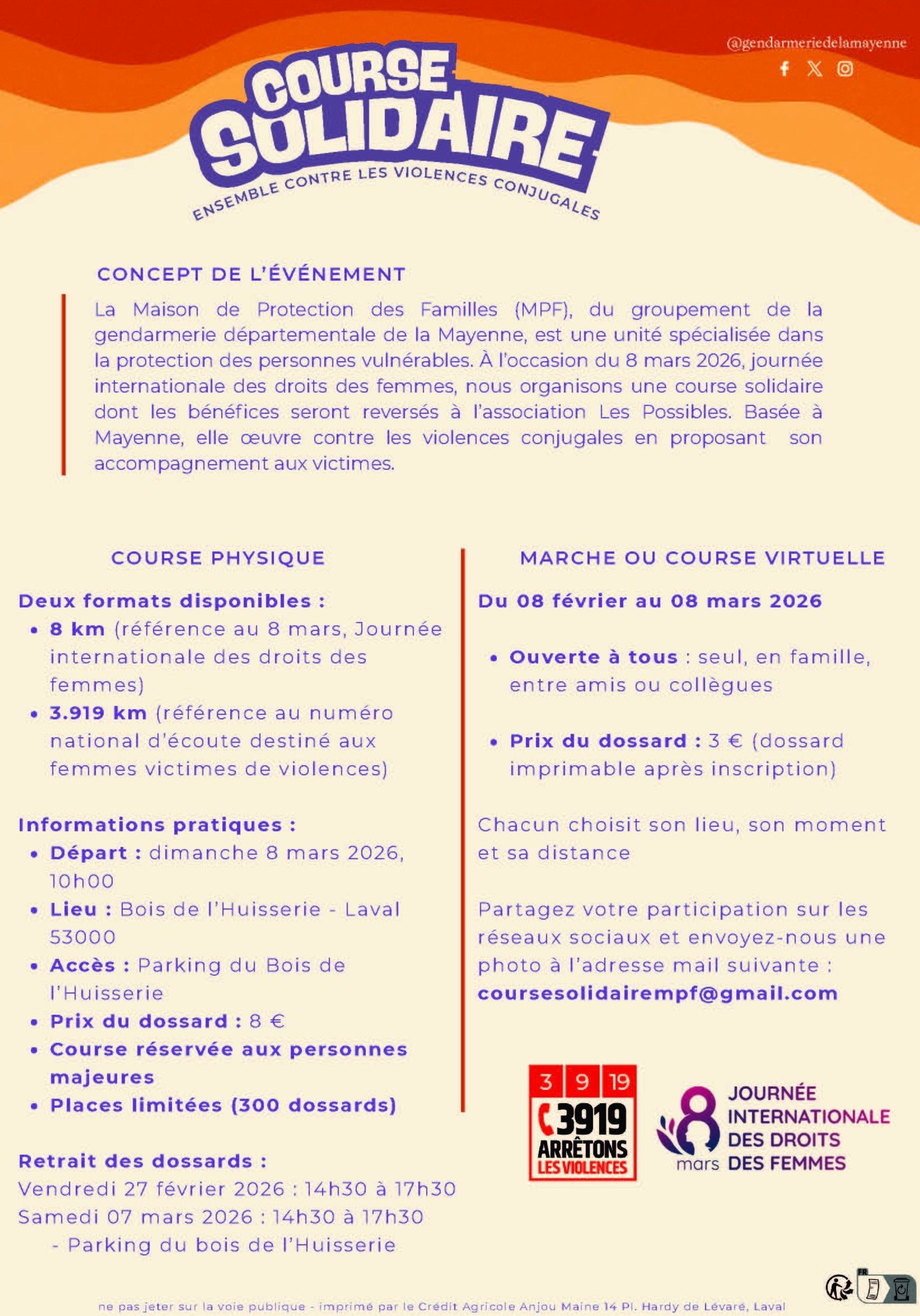 À l’occasion de la Journée internationale des droits des femmes, la Maison de Protection des Familles (MPF) du groupement de la gendarmerie départementale de la Mayenne organise une course solidaire le dimanche 8 mars 2026.